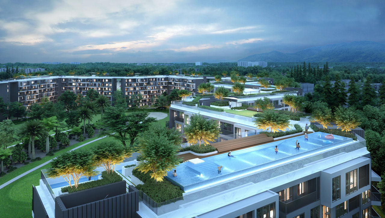 Dự án dành trên 60% diện tích cho cây xanh, cảnh quan và mặt nước. Hệ thống hồ nhân tạo và thảm thực vật đa dạng giúp điều hòa vi khí hậu, giảm nhiệt độ bức xạ và tạo cảm giác trong lành, thư giãn. Các hồ nước có thể được kết nối với hệ thống tưới tiêu tái sử dụng nước mưa, góp phần vào tính bền vững. Trong concept, có thể thấy các hồ uốn lượn quanh tòa nhà, với cây cọ và cỏ xanh, giống như khu vườn ở Care Resort Chiang Mai.