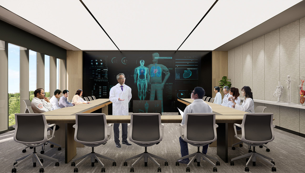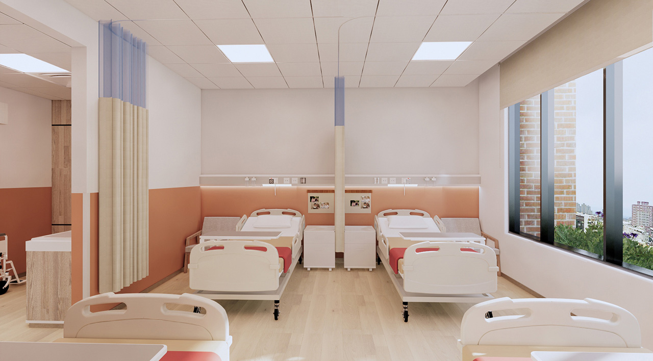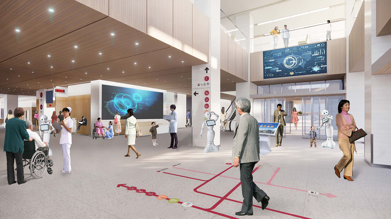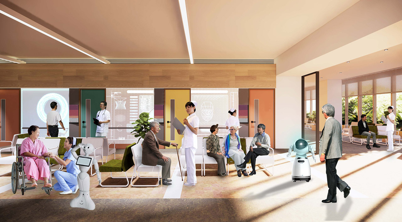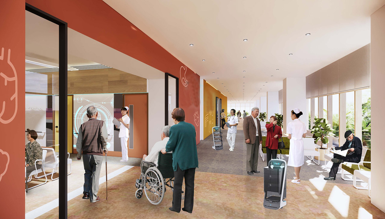 Tầng 1 và 2 dành cho các hoạt động tiếp đón và điều trị ngoại trú, bao gồm khu hành chính, nhà thuốc, phòng khám, khu vật lý trị liệu và phục hồi chức năng. Không gian mở với sảnh lớn được tích hợp màn hình thông tin, robot hướng dẫn và bảng chỉ dẫn điện tử, thể hiện rõ xu hướng bệnh viện thông minh, giúp giảm thời gian chờ đợi và tăng tính tương tác. Từ tầng 3 đến 5 là khu nội trú và điều dưỡng, với phòng tập thể dục nhẹ, phòng châm cứu và massage trị liệu. Mỗi phòng đều có ban công riêng trồng cây xanh, tạo môi trường sống thư thái, giảm bớt cảm giác bệnh viện lạnh lẽo và thúc đẩy quá trình hồi phục.