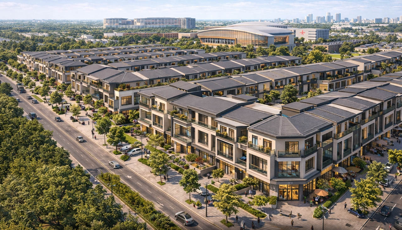 Nhà liền kề - Shophouse (23,5 ha): Cao 4-5 tầng, dọc các trục đường chính, phục vụ kinh doanh.