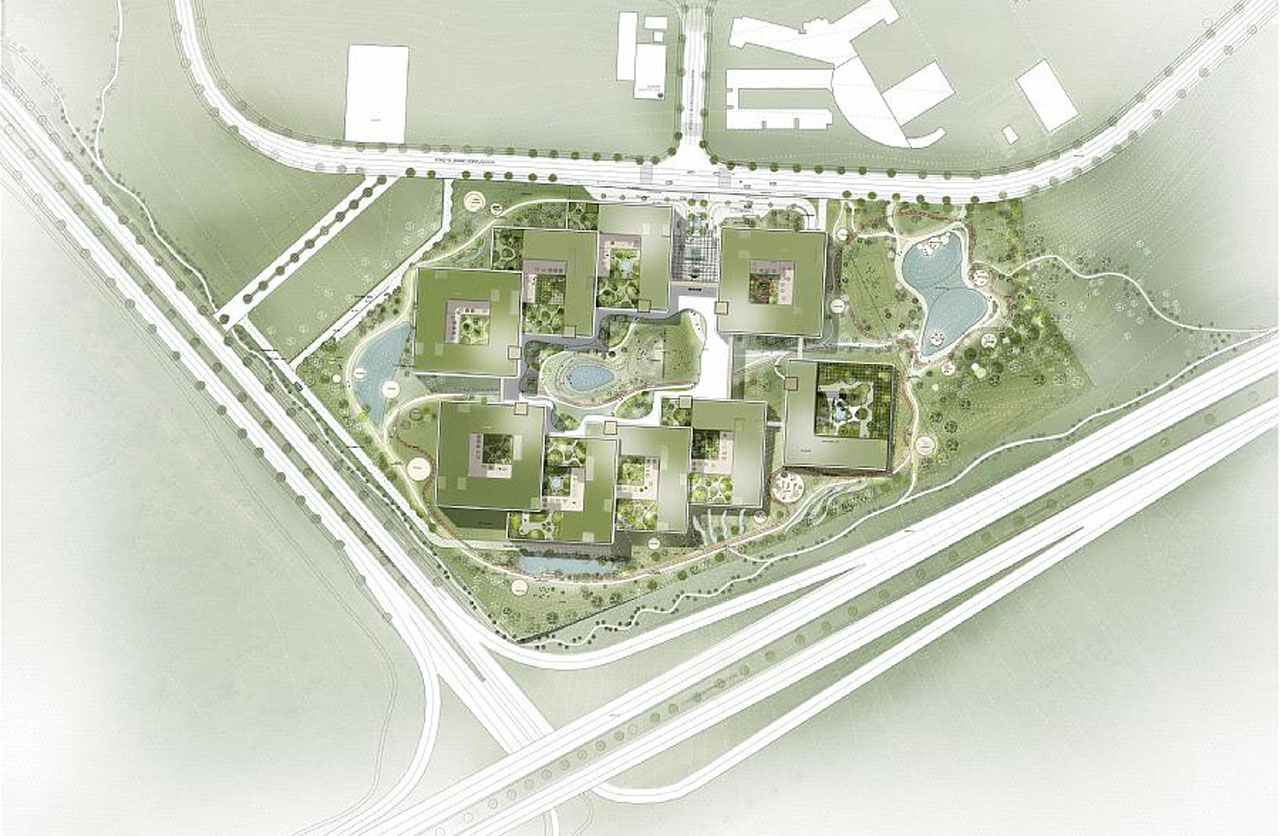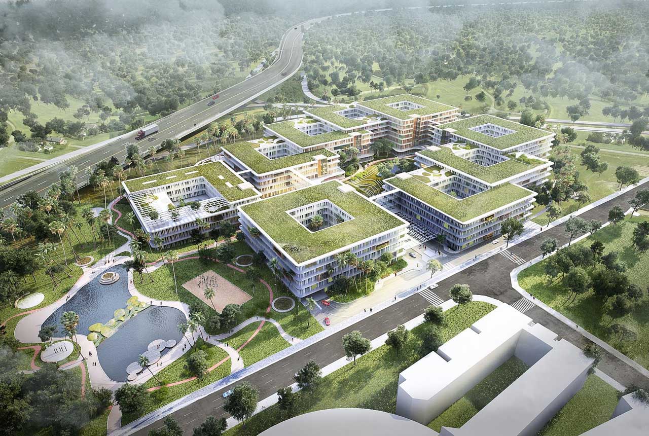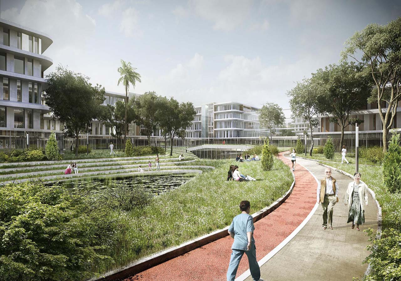 Công trình phác thảo bố cục tổng thể của khu phức hợp dưới dạng các khối hình chữ U hoặc vòng tròn, với sân trong xanh mướt và đường lối uốn lượn. Thiết kế này gợi nhớ đến các khu dưỡng lão cao cấp ở châu Âu, nơi ưu tiên không gian mở để khuyến khích giao lưu cộng đồng. Tiếp theo, công trình hiển thị lối đi ngoài trời với ghế ngồi, cây xanh và tầm nhìn ra các tòa nhà, nhấn mạnh sự hòa quyện giữa kiến trúc và thiên nhiên. Các bức ảnh thứ tư và thứ sáu – view từ trên cao và bản đồ mặt bằng – cho thấy toàn bộ khu vực với mái xanh (green roofs), hồ nước hình oval, đường chạy bộ và công viên, chiếm phần lớn diện tích 8 hecta. Những yếu tố này không chỉ nâng tầm đẳng cấp mà còn thúc đẩy lối sống lành mạnh, giảm stress – một nhu cầu thiết yếu cho người cao tuổi.