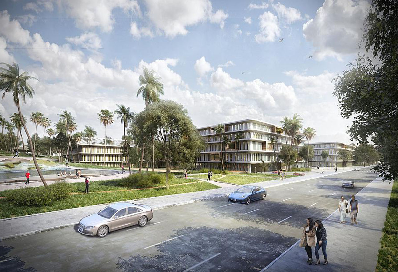 Dự án tập trung vào không gian ngoài trời, với lối đi đỏ nổi bật, hồ nước lily pond và đường phố rộng rãi với xe hơi, thể hiện sự kết nối với môi trường đô thị. Cuối cùng, công trình đã miêu tả khu vực nội thất với mái kính, cây xanh treo và bãi đỗ xe, nơi người cao tuổi có thể dễ dàng tiếp cận phương tiện. Tổng thể, thiết kế này sử dụng vật liệu hiện đại như kính cường lực, bê tông cong và yếu tố xanh, tạo nên một không gian đẳng cấp, chuyên nghiệp, tương tự các dự án dưỡng lão hàng đầu thế giới như ở Singapore hay Nhật Bản.