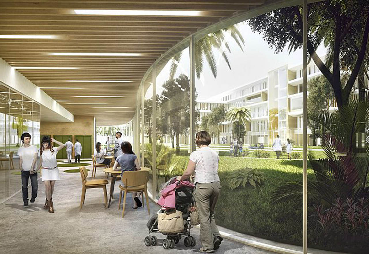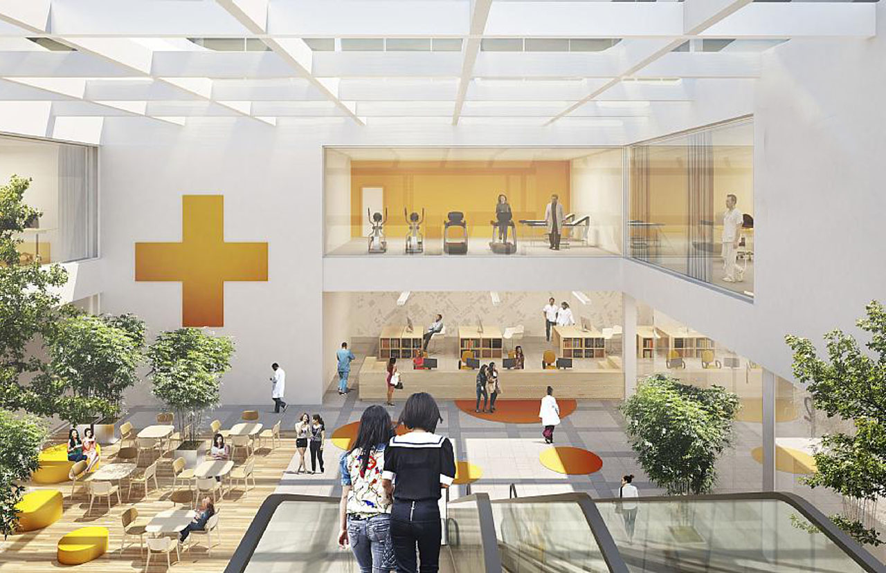 Từ thiết kế của Bệnh viện dưỡng lão Trường Thọ thể hiện rõ nét hiện đại, lấy cảm hứng từ kiến trúc bền vững và thân thiện với môi trường. Dự án miêu tả không gian nội thất rộng lớn với mái kính trong suốt, thang cuốn hiện đại và cây xanh tươi tốt, tạo cảm giác mở và thoáng đãng. Biểu tượng dấu cộng màu vàng nổi bật trên tường, tượng trưng cho dịch vụ y tế, kết hợp với khu vực phòng tập gym trên tầng cao và thư viện bên dưới, cho thấy sự tích hợp đa chức năng. Điều này không chỉ mang tính thẩm mỹ mà còn đảm bảo tính chuyên nghiệp, với các khu vực được thiết kế để dễ dàng tiếp cận, phù hợp cho người cao tuổi di chuyển bằng xe lăn hoặc hỗ trợ.
