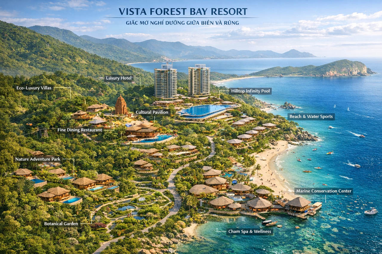 Vista Forest Bay Resort là một ý tưởng đột phá nhằm khai thác tiềm năng du lịch của vùng đất Quy Nhơn, Bình Định. Với diện tích khoảng 25 hecta trên đồi cao, dự án không chỉ mang đến không gian nghỉ dưỡng hiện đại mà còn hòa quyện hài hòa với thiên nhiên, văn hóa địa phương, tạo nên bước đà mạnh mẽ cho ngành du lịch Bình Định. Mặc dù hiện tại chỉ đang ở giai đoạn nghiên cứu tiền khả thi, các chuyên gia đã đánh giá cao tiềm năng của nó nhờ vị trí chiến lược: ven biển, giáp rừng nguyên sinh, và hướng view ra biển cách chỉ 100m. Vista Forest Bay Resort hứa hẹn sẽ trở thành biểu tượng mới, thu hút du khách quốc tế và nội địa, góp phần thúc đẩy kinh tế địa phương thông qua việc tạo việc làm, bảo tồn môi trường và phát triển du lịch bền vững.