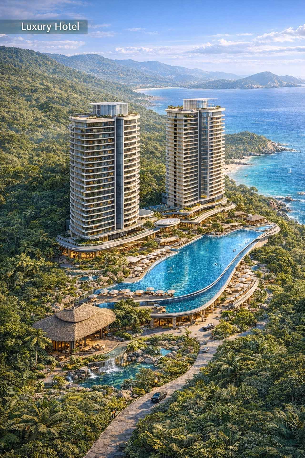 | Khách Sạn | 2 tòa nhà song lập cao 28 tầng, thiết kế hiện đại với ban công view biển. | 500 phòng, từ standard đến suite. | Tích hợp spa trên tầng cao nhất với liệu pháp từ thảo dược rừng địa phương. Khu lounge bar infinity với tầm nhìn 360 độ. |