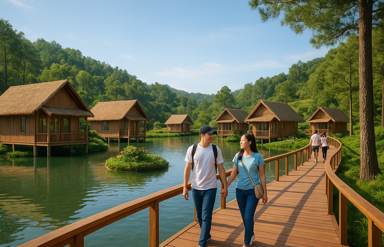 Các bungalow nổi kết hợp sàn gỗ và mái lá cách điệu, vừa hiện đại vừa gần gũi. Hệ thống cầu gỗ nổi kết nối các bungalow với bờ, tạo cảm giác như lạc vào làng nổi. Mỗi bungalow có sân riêng để du khách câu cá, ngắm cảnh và thưởng thức bữa sáng bên hồ. Bổ sung: Tích hợp hệ thống năng lượng mặt trời cho chiếu sáng và nước nóng, phù hợp với xu hướng eco-friendly retreats tại Việt Nam.